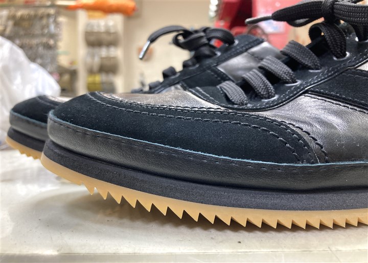 ミュウミュウ(MIUMIU)のスニーカーのオールソール交換修理です樹脂製のソールが経年劣化で崩れていました ![]() ![]() ![]() 元の厚みがよくわからなくなっていますので(^^)アッパーのバランスを見ながらヒールの高さを決めていきます ![]() ![]() ![]() ![]() 新たなソールはスポンジミッドソールに底縫いをかけて固定し、接地面を4ミリ厚クレープゴム&カカトをミシュランヒールで強化してあります これで新しいスニーカーとして生まれ変わりました(^^) 今回の修理金額は両足で31900円です 状態によって料金は前後します |