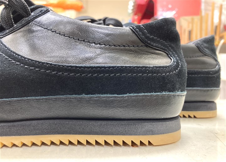 スニーカーのオールソール交換修理ですカカトが減りすぎてアッパーが地面に当たる寸前です(^^) これ以上減るとカカトの革に穴が空きますのでギリギリのタイミングでした ※穴が空いても修理できますが、よりデザインが変わります ![]() ![]() ![]() ![]() ソールを全て剥がしてしまい、つま先にかぶさっていた接着跡に革を縫い付けます その上で、ソールに10ミリのスポンジを貼り前を薄く削ってから底縫いをかけます 最後に同じスポンジをカカトに積み、接地面に6ミリクレープゴムを貼って仕上げています 今回は・・ ・つま先の革がこげ茶の表側 ・スポンジミッドソールは黒 ・ゴムアウトソールはこげ茶 ・・になっています ![]() ![]() ![]() ![]() 革、スポンジ、ゴムソールの色を変えれば仕上がりの印象をガラリと変えることができます 一例で言いますと・・ ・ミッドソールを白にするとニューバランスのようにスニーカー感が強くなります ・すべて同じ色にすると一体感が出ます ・・このあたりはお好みでお選びください(^^) 今回の修理金額は両足で28600円です 状態によって料金は前後します |