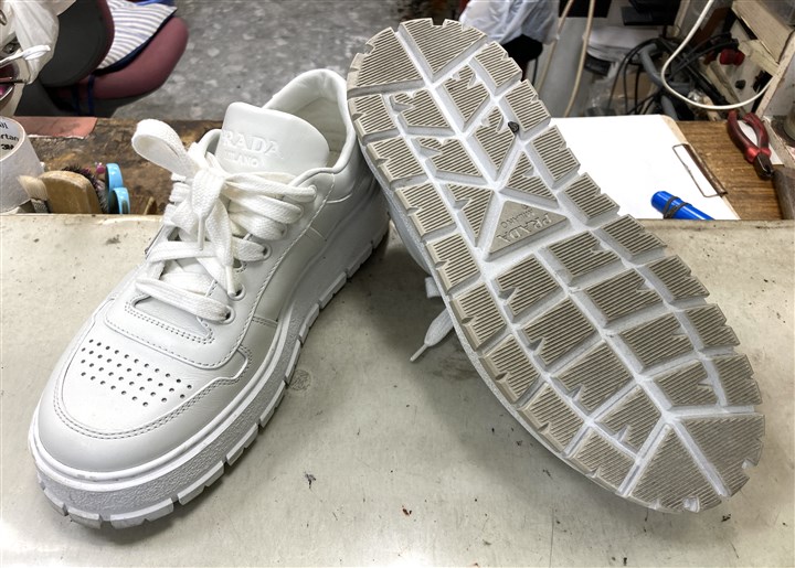 | 2025.12.22 プラダ(PRADA)のスニーカーのソール補強修理です 凹凸が大きいので(^^)残したままゴムを貼ります ![]() 底面を薄く削り整え、ソール下部が斜めになっていますのでその淵に沿ってゴムを貼っていきます 4ミリ厚のクレープゴムを使いました ![]() ![]() ![]() ![]() はい完成です 底面が細かく分かれていますので(^^)ボンド塗布がまあまあ大変です♪ 今回の修理は両足で7700円です 状態によって料金は前後します |