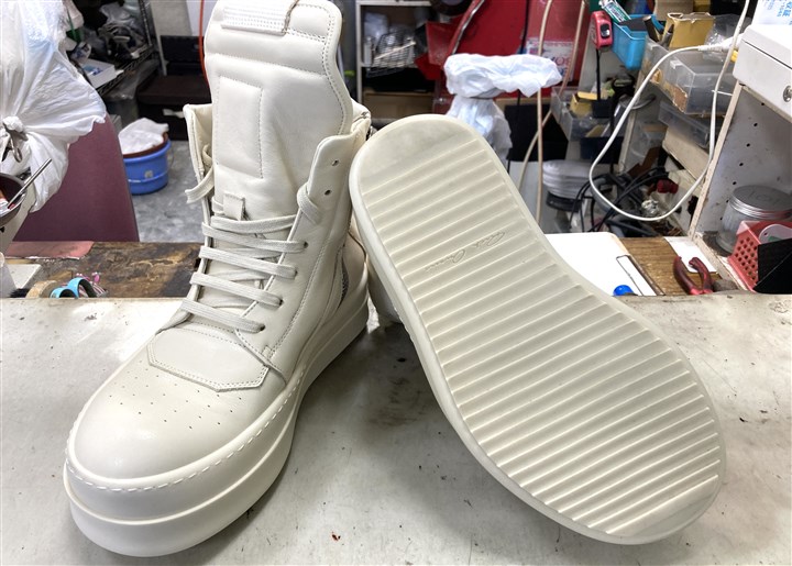 | 2025.12.22 リックオウエンス(RickOwens)メガジオバスケットのソール補強修理です 全身真っ白のモデルです(^^) ![]() 底面のギザギザを削り、一段高くなっている淵に沿ってゴムを貼っていきます ソールの色味に合わせオフホワイトのビブラム342ソールを使っています ![]() ![]() ![]() ![]() はい完成です(^^) これで元よりも耐久性の高いギザギザになりました♪ 今回の修理は両足で11000円です 状態によって料金は前後します |
