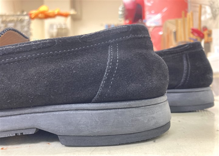 | 2026.1.16 ローファータイプのソール補強修理です ゴムをセパレートに貼り付けます ![]() ソール前とカカト部分をそれぞれ薄く削り、淵から少し内側のラインでゴムを貼っています ビブラムスカルソール&タフZを使いました ![]() ![]() ![]() ![]() こういったカカトに傾斜があるタイプは(^^)底面の厚みがある程度あれば傾斜の角を削りなだらかに加工して全体にゴムが貼れます 今回は底がかなり薄く加工すると穴が空きそうでしたので、こういった仕上げになっています 今回の修理は両足で14300円です 状態によって料金は前後します |