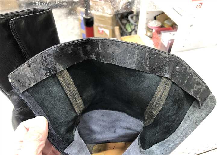 レディスロングブーツの履き口、ファスナーベロ、中貼りの