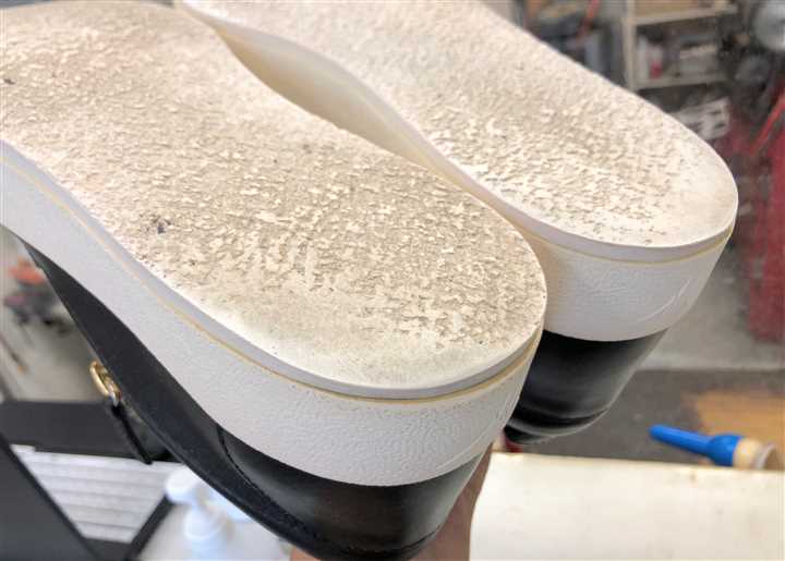 ジュゼッペ・ザノッティ(Giuseppe Zanotti)のソール補強修理、2足口です以前にもザノッティのご依頼を頂いたお客様です またのご依頼ありがとうございます(^^) ![]() 接地面をフラットに削るのですがカカトが少し減っていますので、少し削って偏りを均します その上で、淵から少し内側のラインで全体に6ミリ厚クレープゴムを貼っています ![]() ![]() ![]() これでまだまだガンガン履けます(^^) カカトが減ってきたらまたお声がけくださいませ 今回の修理金額はそれぞれ両足で8800円です 状態によって料金は前後します |