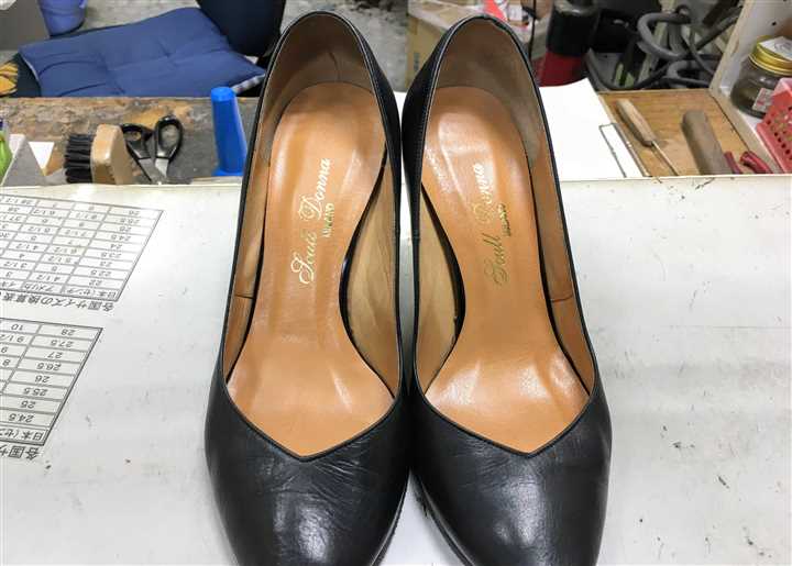 パンプスのヒールカットと中貼りの貼替えです |