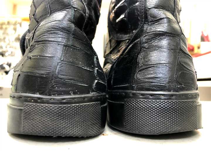 スニーカーソール補強ゴムのメンテナンス修理です以前貼り付けたスカルソールのカカトが減ってきましたので、部分的にカットしてカカトのみ貼り替えます ![]() 後ろから7〜8センチでラインを取りゴムをカット! カット面を丁寧に削り古いボンドなどを削り落とします 今回は同じスカルソールで貼り替えています(^^) ![]() ![]() ![]() 同じゴムで貼り替えていますので仕上がりもキレイですね〜〜 こうして同じにしてもいいですし更に耐久性の高いゴムも使用可能です(^^) 今回の修理金額は両足で3300円です 状態によって料金は前後します |