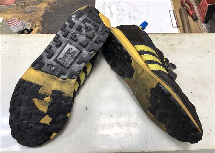アディダス(adidas)のスニーカーオールソール交換です傷んだソールを丸ごと作り直します(^^) ![]() ![]() ![]() 元はつま先が反り上がっている形状のソールでしたが アッパーのつま先がかなり柔らかいので ここに新たなソールを貼り付けても剥がれてしまいそうです ということでこの接着後にスエードを縫い付けて隠し 平面ソールをつけています 10ミリ厚のスポンジを底に貼り底縫いをかけて固定した上で カカトにもう1枚積んで高さを出し 接地面を6ミリ厚のクレープゴムで仕上げています ![]() ![]() ![]() ![]() あと、分解したところ中敷きも中底もボロボロでしたので 革で中敷きを作り直しています (市販の中敷きを後ほど敷いています) ※革の中底に底縫いのステッチを掛けていますので かなり強力に固定できています ![]() これで復活ですね(^^) 今回の修理は オールソールが26400円、中底交換が4400円です 状態によって料金は前後します |