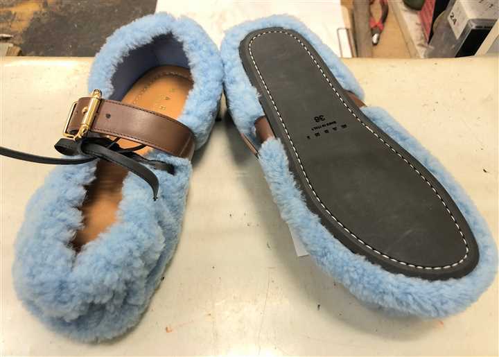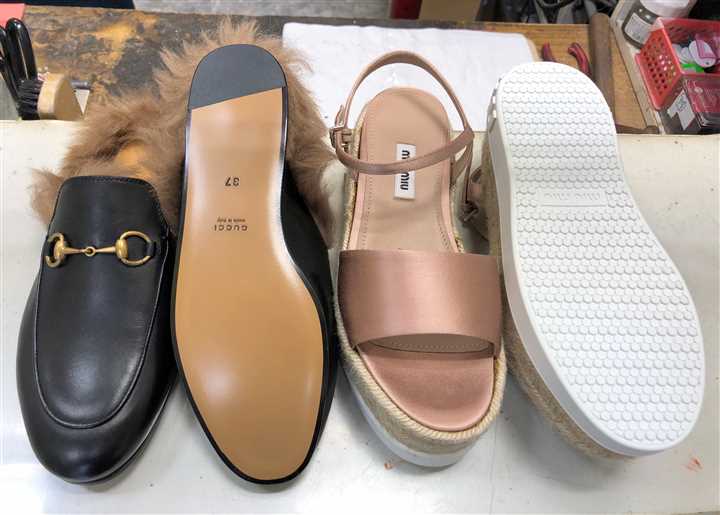 グッチ(GUCCI)とミュウミュウ(MIUMIU)のサンダルのソール補強ですどちらも新品のうちにソール補強をします!(^^) ![]() それぞれ接地面を薄く削り 淵から少し内側のラインでゴムを貼ります グッチには4ミリ厚のクレープゴムを MIUMIUには6ミリ厚のクレープゴムを貼っています ![]() ![]() ![]() こうして最初にゴムを貼っておけば サンダルもキレイに長く履けます(^^) カカトが減ったら部分貼り替え可能なので 減り過ぎに注意です〜〜♪ 今回の修理金額はそれぞれ両足で7700円です 状態によって料金は前後します |