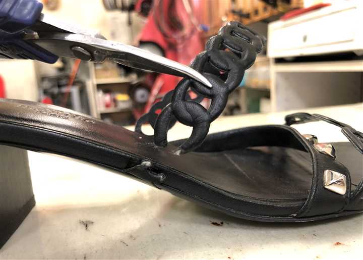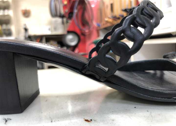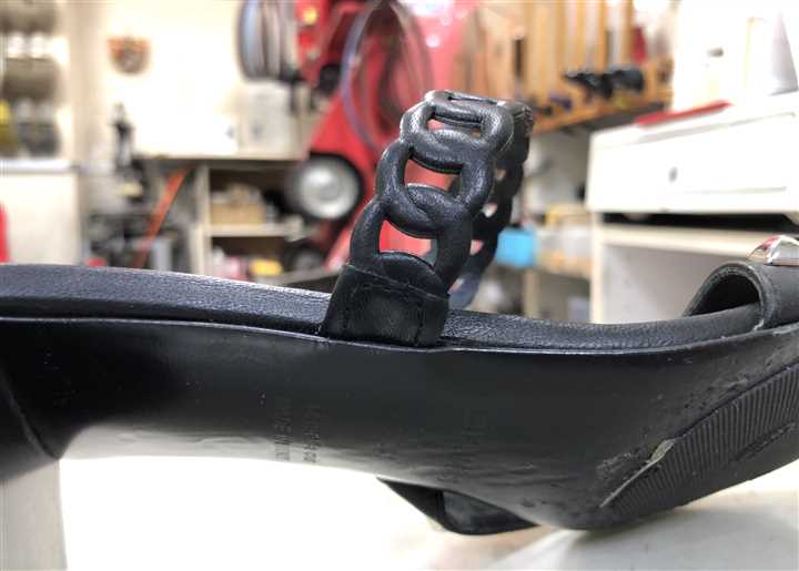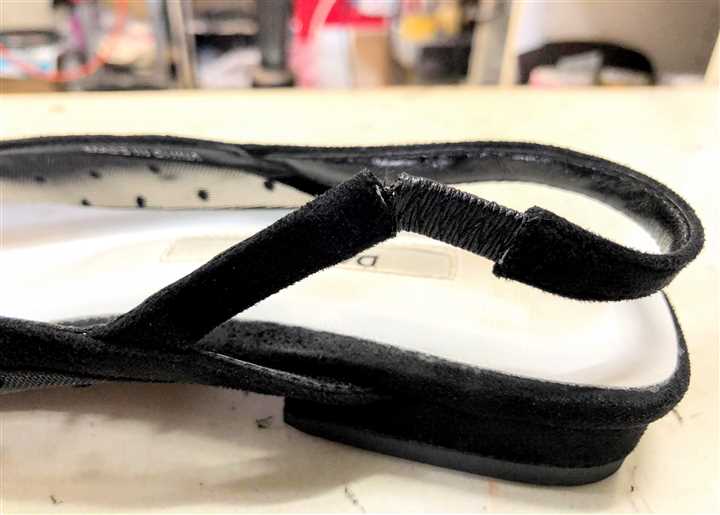 サンダルのバックバンドゴムの交換ですこちらのゴムは消耗品ですので 伸びたり切れたりしたら、交換しましょう(^^) ![]() ![]() 両側のステッチを解いて切れたゴムを外し 同じようなゴムを縫い付けて仕上げています このゴムは「革巻きゴム」と呼ばれていて 通常のゴムよりも修理費が高くなっています(^^) ![]() ![]() 新たなゴムを取り付ける際には 表側の元のミシン穴を拾って縫い付けます ですが、裏側のミシン穴はどうしてもズレてしまいますので あらかじめご了承くださいませ(^^) 今回の修理金額は1箇所で3300円です 状態によって料金は前後します |