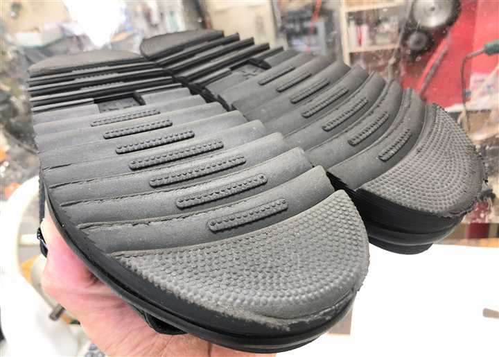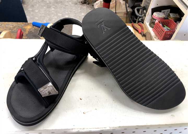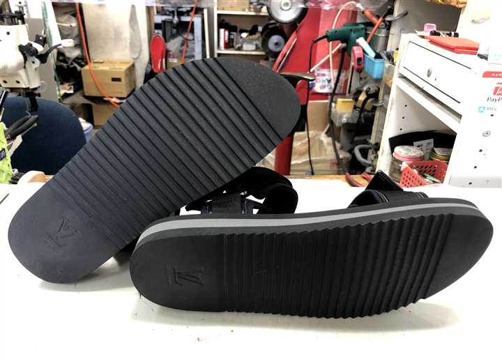 ルイ・ヴィトン(LOUIS VUITTON)のサンダルの ソールを新しいうちに保護します ラダー型のソールをギザギザのシャークソールに 加工するようなイメージですね(^^) ![]() ![]() ![]() 今回はご希望でソールの淵までゴムを貼っています 接地面の凹凸をフラットに削り落としてから 淵に沿ってビブラム342ソールを貼り付けました こうやって淵に沿ってゴムを貼ると ソールにボリュームを出すことができるんですね(^^) ![]() ![]() ![]() ソールのエッジが鋭くなって シャープな印象になりましたね(^^) スポンジ系のソールの接地面がゴムになり 滑り止め効果も抜群ですよ 今回の修理金額は両足で11000円です 状態によって料金は前後します |