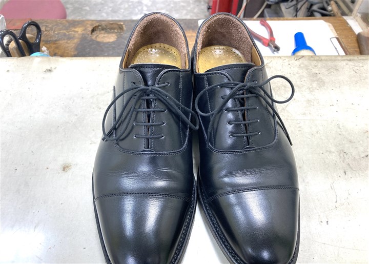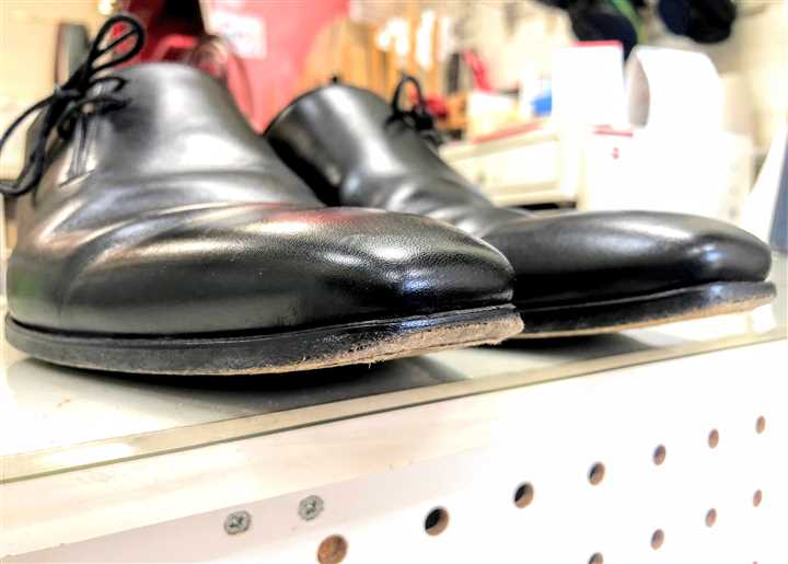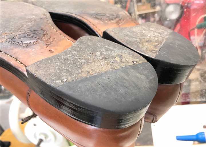 紳士革靴のソールとヒールの修理ですキレイに履いていただいているので直し甲斐があります(^^)今回はつま先も戻します ![]() ![]() こんな風につま先がすり減っている場合は、厚みを戻してからハーフソールを貼ります ということで、革を足してつま先の厚みを元に戻してから、ソール前面にゴムハーフソールを貼っています カカトは革ハーフリフトが付いていましたが、お客様とのご相談の結果ふつうのカカトゴムで貼り替えています こちらのゴム、実は両方ともミシュランです ![]() ![]() つま先の側面はピカピカに磨いていますので、これで気持ちよく履いていただけると思います 今後は、貼り付けたゴムがなくなり切る前に貼替えメンテナンスを実施していただければ長くキレイに履けます 今回の修理金額はソールが4400円、カカトが2200円です 状態によって料金は前後します |