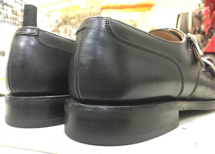 紳士革靴のカカト内側の破れとソールカカトの貼替え修理ですカカト内側は革が破れていますので上から新たに革を貼り付けて修理します ![]() ![]() ![]() ![]() くるぶし〜くるぶしぐらいの範囲で似た色のスエードを貼っています(^^) 外側に元々あるステッチを利用して縫い付けていますので、外側から修理跡はほぼわかりません ソールカカトはリフトがすり減っていますので、似たような革ハーフリフトで貼り替えます ![]() ![]() ![]() はい完成です(^^) これでまだまだ履けます〜 今回の修理金額はカカト内側が6600円、革ハーフリフトが5500円です 状態によって料金は前後します |